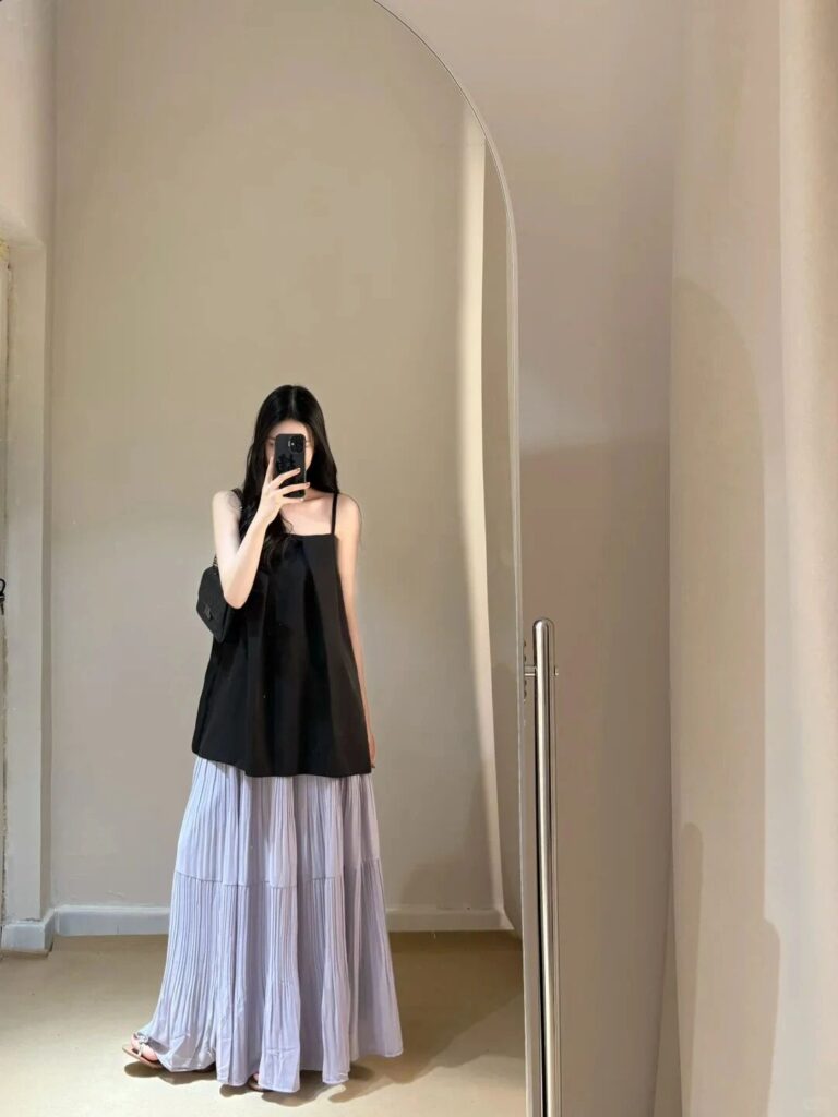 Black spaghetti-strap top + purple pleated skirt, black handbag + sandals. Layered styling creates soft, romantic depth. 💜 Perfect for dates or art exhibitions, showcasing feminine grace.