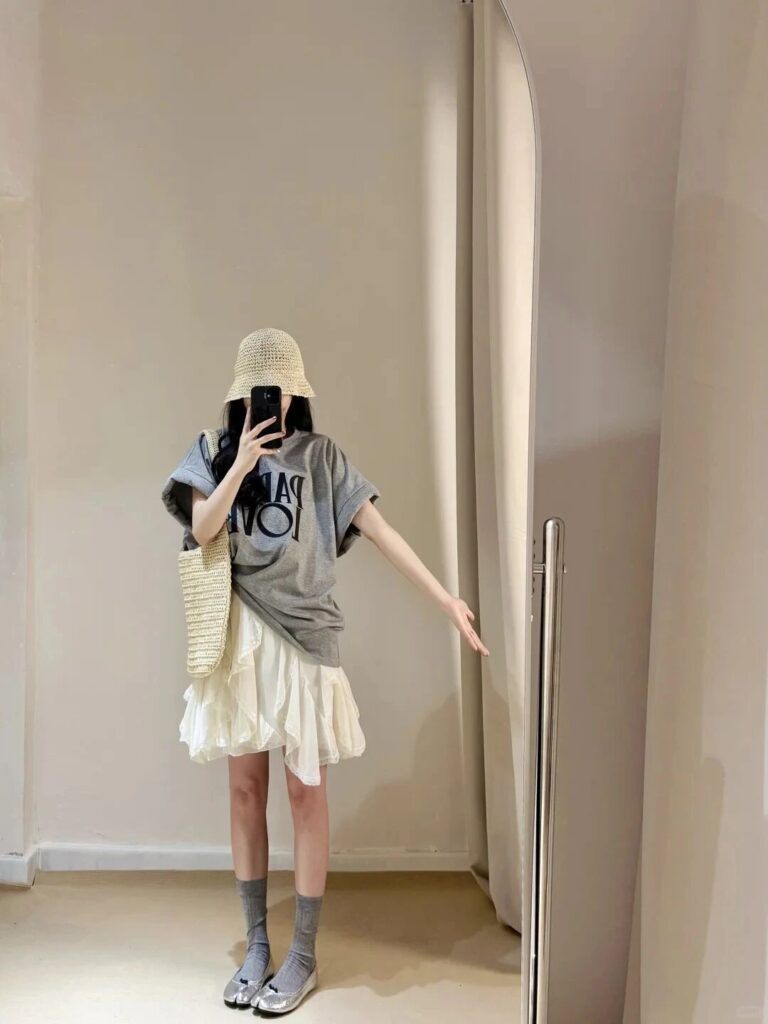 Gray printed tee + white ruffled skirt, straw hat + woven bag, gray socks with silver shoes for a playful mix. Instant seaside getaway feel. 🌊 Perfect for: short trips, open-air markets, laid-back and effortless.
