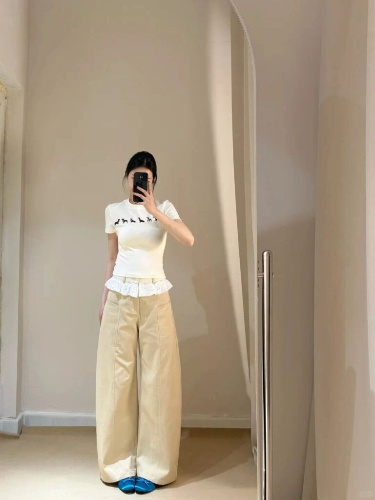 White tee (pony print) + beige wide-leg pants, accented with blue shoes. The oversized silhouette elongates the legs, perfect for both work and leisure. 🤍 Suitable for: Office settings and everyday outings—simple yet never plain.